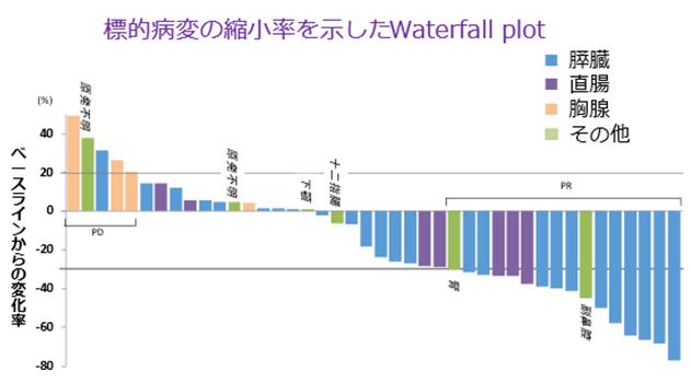 對在國立癌癥研究中心接受PRRT治療的42例患者的療效總結顯示,總緩解率為38.1%。其中胰腺原發灶44.0%,直腸原發灶42.9%。包括腫瘤未增殖的病例在內,腫瘤穩定效果總體為90.5%,胰腺為96.0%,直腸為100%,胸腺為50%(圖3)。有11例患者因腫瘤生長或貧血等副作用而停止治療。