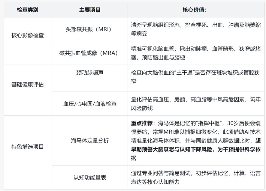 ·看項目:對比不同機構的套餐內容。基礎套餐(MRI+MRA)是核心。若特別關注記憶力或家族有癡呆史,建議增加“海馬體定量分析”項目。